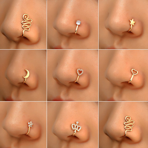 1ชิ้นแหวนจมูกทองแดงแบบไม่เจาะเจาะหูรูปหัวใจดาวพระจันทร์เพทายมงกุฎคลิปหนีบบนจมูกต่างหูเครื่องประดับร่างกายสำหรับผู้หญิงผู้หญิงของขวัญ